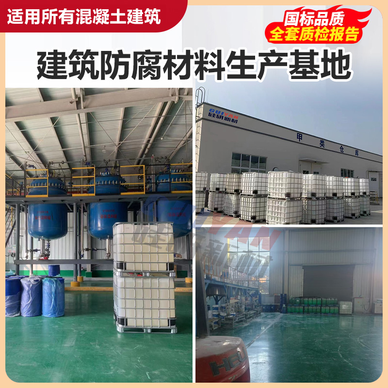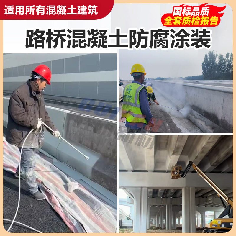 本产品为辛基三乙氧基硅烷膏体和水性聚合物有机硅防腐涂料双组份,它能渗入混凝土内部3mm以上,在内部发生化学反应,形成深度达3mm以上的防水保护层,又使外部形成厚度约200um的防腐漆膜,从外部和内部阻止了水分和有害物质的侵入。