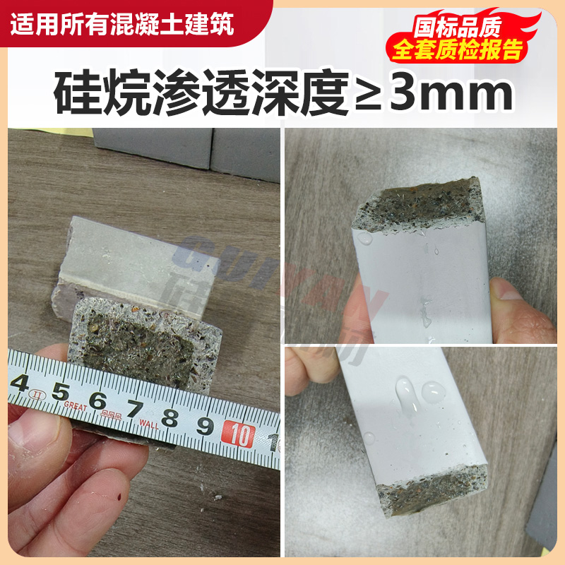 本产品符合《水运工程结构耐久性设计标准(JTS153-2015)》设计指标要求。膏体硅烷有效含量≥80%,液体硅烷有效含量≥99%。它能渗入≥C45混凝土内部3mm以上,在内部发生化学反应,形成深度达3mm以上的防水保护层,从外部阻止水分和有害物质的侵入。适用于桥梁墩柱、水库大坝、海港码头等混凝土过水面;可长期浸泡于水中,抗盐碱,耐腐蚀。