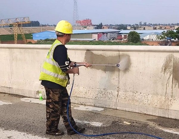4、喷涂层数应由预喷涂试验确定,建议喷涂2层,每层使用量至少200ml(200g)/m2,下一层应在上一层喷涂后表层未干前施工(间隔时间与天气温度有关,正常间隔40分钟-2小时之间,以混凝土表面60%以上部位干透,呈现混凝土原表面发白状即可施工下一道)。